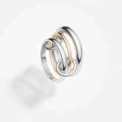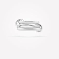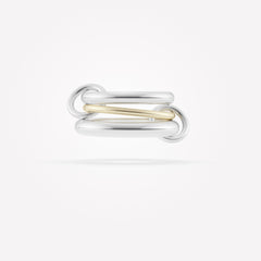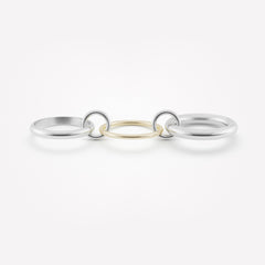 The Amaryllis features a palette of multi-gauge rings, with two full round bands framing a half-round. All three bands are joined by a pair of floating sterling silver connectors, enabling the ring to be worn as a single piece or across multiple fingers as a modular design. Each Amaryllis is individually handmade in Los Angeles.