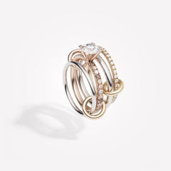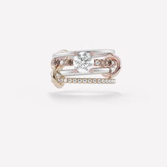 The Anath is composed of four linked rings in mixed 18k rose, yellow and white gold with u-pavé set cognac, champagne and white diamonds. This silhouette is best complemented by a one carat to two carat stone.