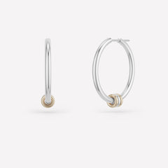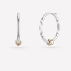 The Argo SG Hoops feature feather light hoops in .925 sterling silver with three orbiting annulets in mixed 18k yellow gold and .925 sterling silver. Each pair of Argo SG Hoops is individually handmade in Los Angeles.