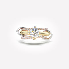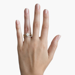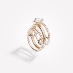 Named for one of the most venerated of the ancient Greek deities, the Artemis V linked ring represents the strength and protection that love provides. The Artemis V linked ring is composed of three linked rings in 18K yellow and rose gold, weighted with a one carat center white diamond and 18k white gold connectors. All solitaire stones are individually selected by our team, and each Artemis V linked ring is handmade in Los Angeles.