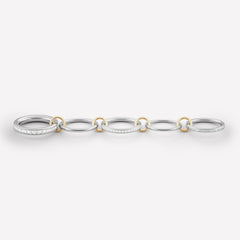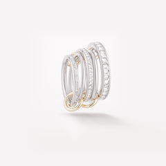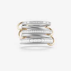 The Augusta linked ring features a bold profile of five linked bands in 18k white gold with channel-set baguette and carrè diamonds, tethered by four 18k yellow gold connectors.