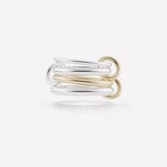 The Cancer emphasizes fluidity of motion and balance with a multi-gauged design of full and half round bands. Featuring mixtures of 18k yellow and rose gold, sterling silver and pavé white diamonds, the Cancer can be worn stacked or across multiple fingers for a magnificent display of interlocked bands. Each Cancer is individually handmade in Los Angeles.