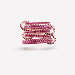 The Delphinus Rouge is comprised of five linked rings of 18k rose gold, set with full cut micro pavé dark pink sapphires. All bands are joined by 18k rose gold connectors pavé-set with full-cut rubies. Each Delphinus Rouge is individually handmade in Los Angeles.