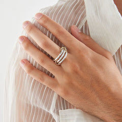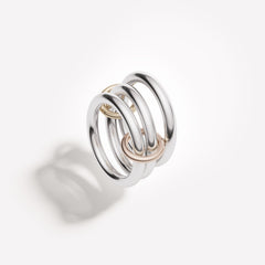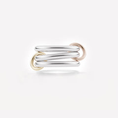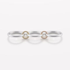 The Dua MX linked ring is composed of three 2.8mm gauge .925 sterling silver bands, linked together by 18k rose gold and yellow gold connectors. Each Dua MX is individually handmade in Los Angeles.