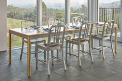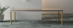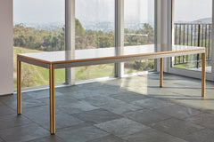 The Elam Table features a burnished bronze finish with an aluminum frame and brass legs.