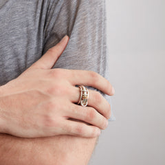 Expressive and balanced, the Gemini is a study in creative harmony. Constructed of three bands linked by two connectors, its substantial central band is adorned by three orbiting annulets. With its tactile spirit and unisex appeal, the Gemini is an effortless mainstay. Each Gemini is individually handmade in Los Angeles.