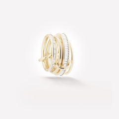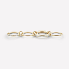 The Lehmus linked ring features a classic med-weight profile, with four linked bands of 18k yellow gold and channel-set baguette diamonds, held together by three 18k yellow gold connectors. Each Lehmus is individually handmade in Los Angeles.