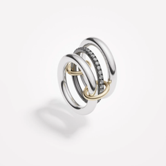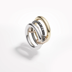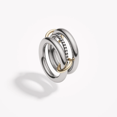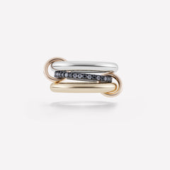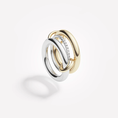 One of our signature pave styles, the Libra ring emulates balance and poise. A core band of pave diamonds is framed by two substantial bands of 18k gold or lustrous sterling silver, and linked by two 18k gold connectors. Many paths lead to harmony, and the Libra is available in diverse colorways for perfect balance. Each Libra is individually handmade in Los Angeles.