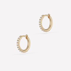 The Micro Hoop Pavé 1 is constructed entirely of 18k gold and features one row of radiant pavé diamonds. This style’s seamless comfort closure creates an uninterrupted silhouette, ensuring the focus is entirely on the brilliance of the hoop’s luxurious materials and stunning spectrum of light. Each Micro Hoop Pavé 1 is individually handmade in Los Angeles.