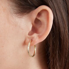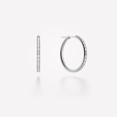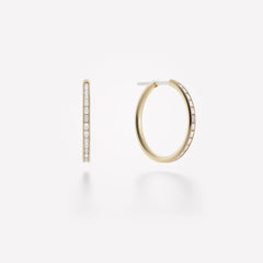 The Miri Hoop Earrings are 20mm 18k gold hoops with channel-set baguette diamonds (approx. 1.0 cttw). Available in 18k yellow, white or rose gold.