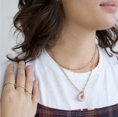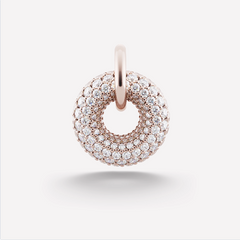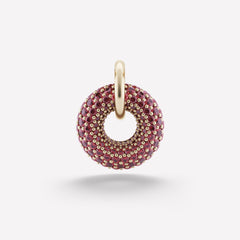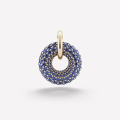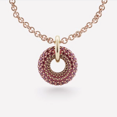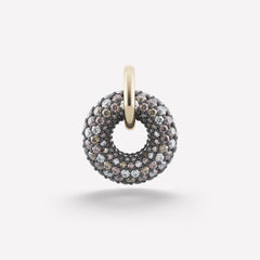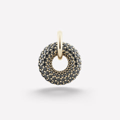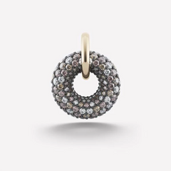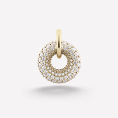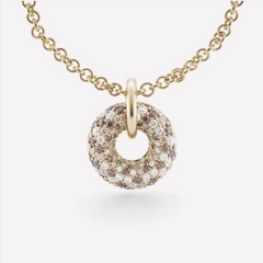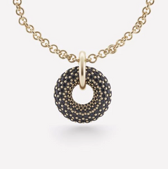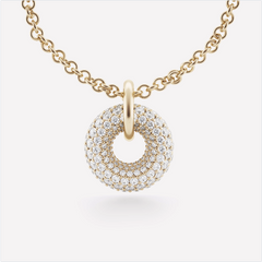 The Nebula Pendant epitomizes Spinelli Kilcollin's signature circular simplicity with the with a timeless statement. Lined with hand-set micro pavé stones, each 18k gold pendant displays a strikingly detailed interplay of space and material. All Nebula Pendants are designed to pair perfectly with the Gravity Chain.