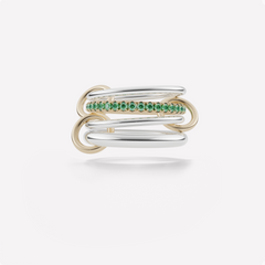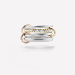 The Nimbus is comprised of 4 linked bands crafted from .925 sterling silver and 18k yellow gold, featuring a pavé band set with hand-selected gray or white diamonds. Complimented by an array of matching connectors, the Nimbus can be worn spread across multiple fingers or stacked as a structural whole. Each Nimbus is individually handmade in Los Angeles.