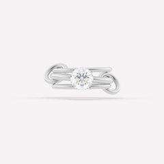 The Nysa Platinum represents effortless beauty and timeless design with its trio of solid, full-round platinum bands and matching orbiting connectors. A central band showcases a solitaire white diamond of your choice, framed by a platinum bezel for a monochrome display. The Nysa Platinum can be fully customized with a variety of stone and metal options to celebrate your love. Each Nysa Platinum is individually handmade in Los Angeles.