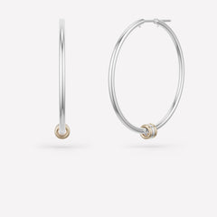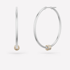 The Pegasus Hoops are the largest single hoop available and feature a .925 sterling silver hoop construction, with three orbiting annulets in mixed 18k yellow gold and silver. A hinged post closure in 18k white gold ensures the earring fits comfortably and securely. Each pair of Pegasus Hoops are individually handcrafted in Los Angeles.