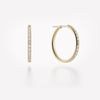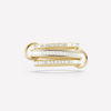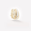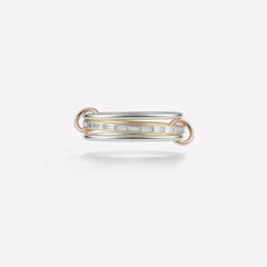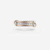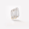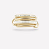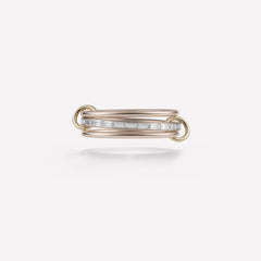 The Rhea YG displays three delicate rings of 18k yellow gold interlocked by matching 18k yellow gold connectors, and features a center band of channel-set white baguette diamonds. Each Rhea YG is individually handmade in Los Angeles.