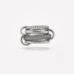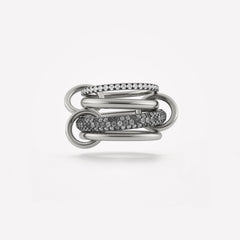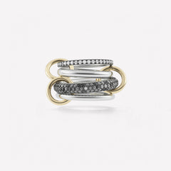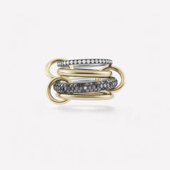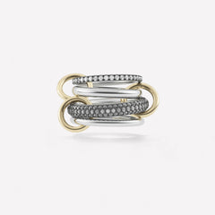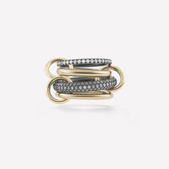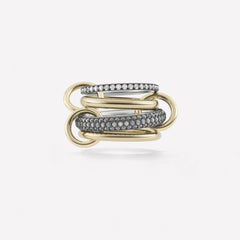 Like its namesake, the Vega SG constellation, the Vega emanates a stunning spectrum of light. The first band features brilliant, spectral white diamonds, U-set to expose every angle to light. Centered between two solid lustrous metal bands is the Vega SG's core: a 3.8mm band of micro pavé diamonds, set in contrasting prongs to create a stunning interplay of light and shadow. A network of three gold connectors unites the ring’s components. Arresting and imminently approachable, the Vega SG is a modular design that can be worn multiple ways. Each Vega SG is individually handmade in Los Angeles.