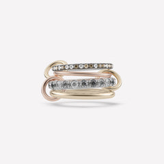 The Ziya MX V linked ring is comprised for four bands of 18k yellow gold and .925 sterling silver, with a mix of gray and white diamonds. Three orbiting connectors in matching 18k yellow gold allow the Ziya MX V linked ring to be worn spread across multiple fingers or stacked as a sculptural whole. Each Ziya MX V linked ring is handmade in Los Angeles.